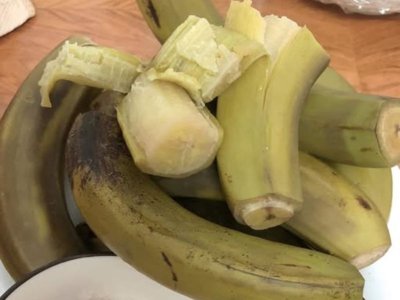 - Ngâm khử chát: Chuối xanh gọt vỏ nên được ngâm ngay vào nước lạnh có pha chút muối loãng trong khoảng 10 – 15 phút.